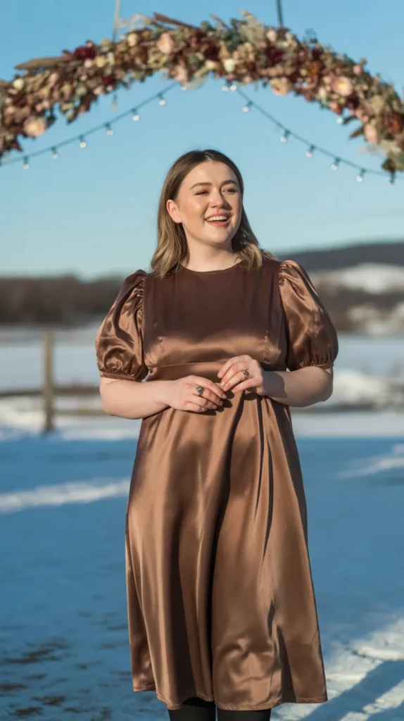Warm, earthy, and sophisticated this underrated color brings cozy elegance to winter weddings. The puff sleeves add subtle drama, while the satin texture feels modern and luxurious.