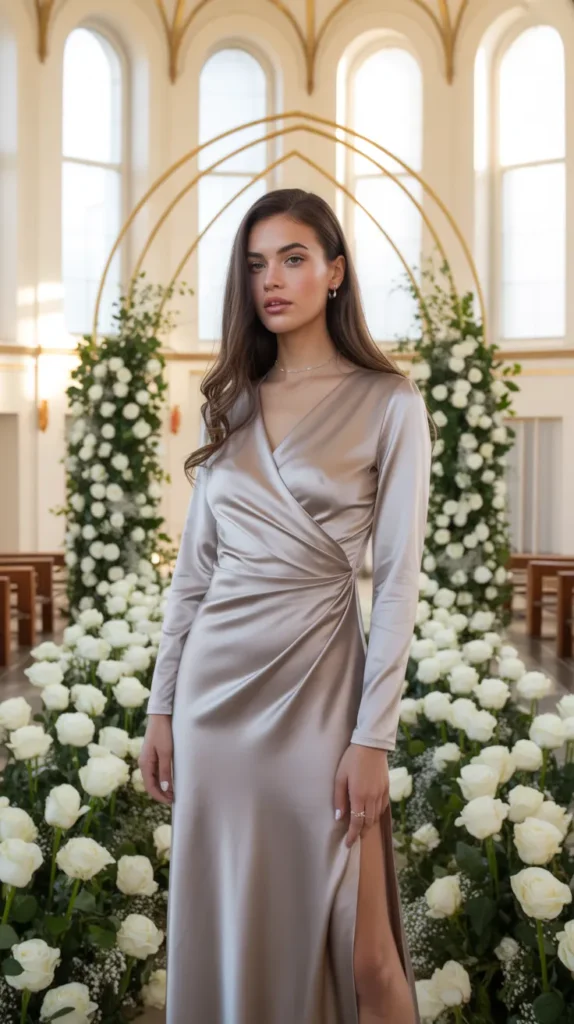 A universally flattering silhouette that drapes beautifully across the body. The satinβs soft sheen adds sophistication, while the long sleeves provide warmth making it ideal for both formal winter wedding guest dress codes and semi-formal gatherings.