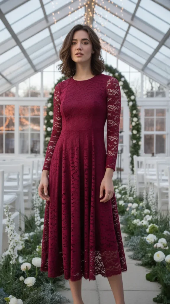 A romantic choice that feels both soft and sophisticated. The lace texture adds dimension, and the midi cut flatters every shape. Pair with nude heels and pearl jewelry to complete this elegant winter wedding guest dress look.