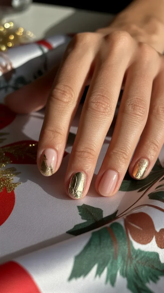 Gold foil designs add an artisanal, luxe touch. Layer them over nude or clear polish for effortless classy nails glam that still feels light and festive. π