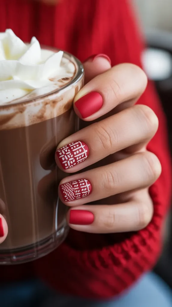 The coziest trend of the season. Red matte nails embossed with white Fair Isle textures make your xmas nails look straight out of a winter cabin. π§£