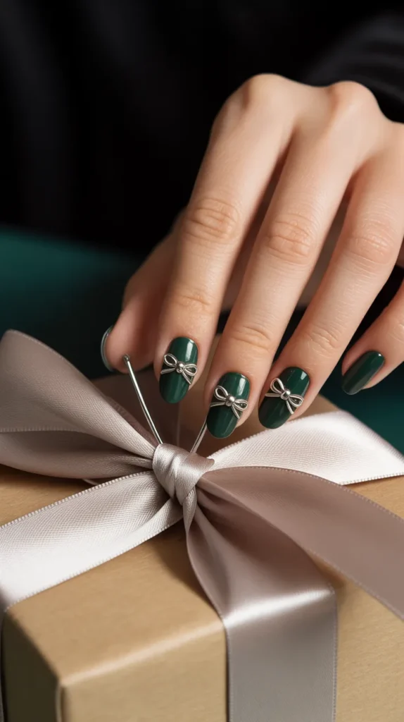 Tiny silver bows on glossy green nails create an instant gift-wrapped effect. This fun, classy twist adds a dose of festive xmas nails polish. π