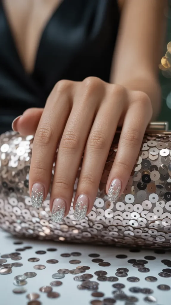 Soft nude fading into silver glitter the look of falling snow at your fingertips. This minimalist gradient gives your December nails pure seasonal sparkle. π¨οΈ