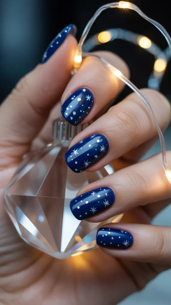 Gaze at your fingertips and youβll see a winter sky. Midnight blue with tiny stars gives your winter nails celestial magic that feels timeless. π