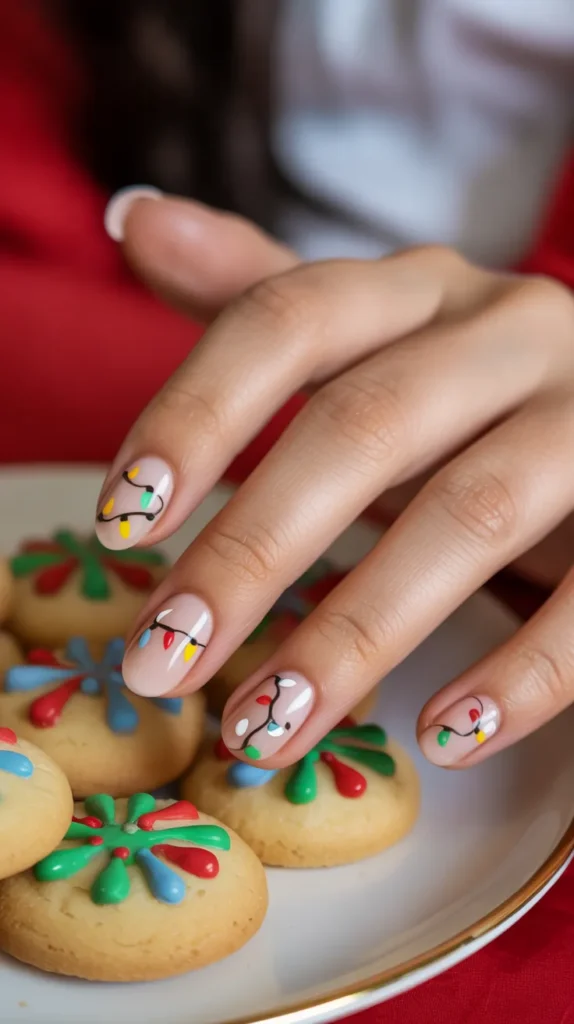 Tiny painted lights across a nude base cute, whimsical, and full of cheer. These xmas nails are guaranteed to brighten your day (and your outfit). π‘