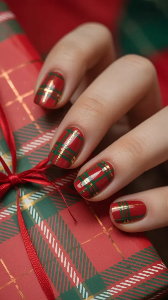 Red-and-green plaid nails never go out of style. Add gold accents and youβve got December nails that balance cozy patterns with timeless chic. π§€