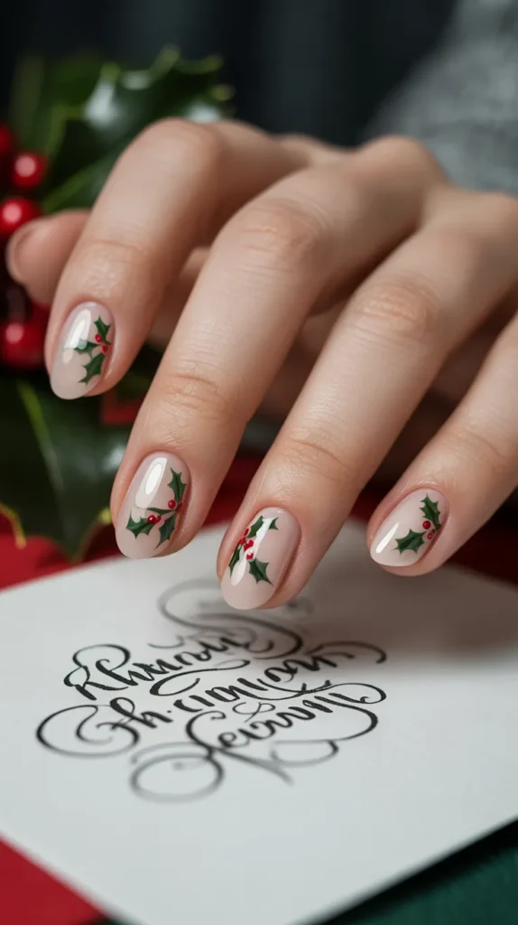 Delicate holly leaf accents bring nature-inspired charm to your manicure. Itβs sweet, detailed, and full of xmas nails personality that never feels overdone. π