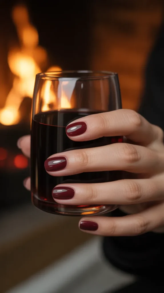 Warm, rich, and deliciously deep mulled wine nails are cozy luxury. The burgundy-red finish adds dimension and comfort to your December nails lineup. π·